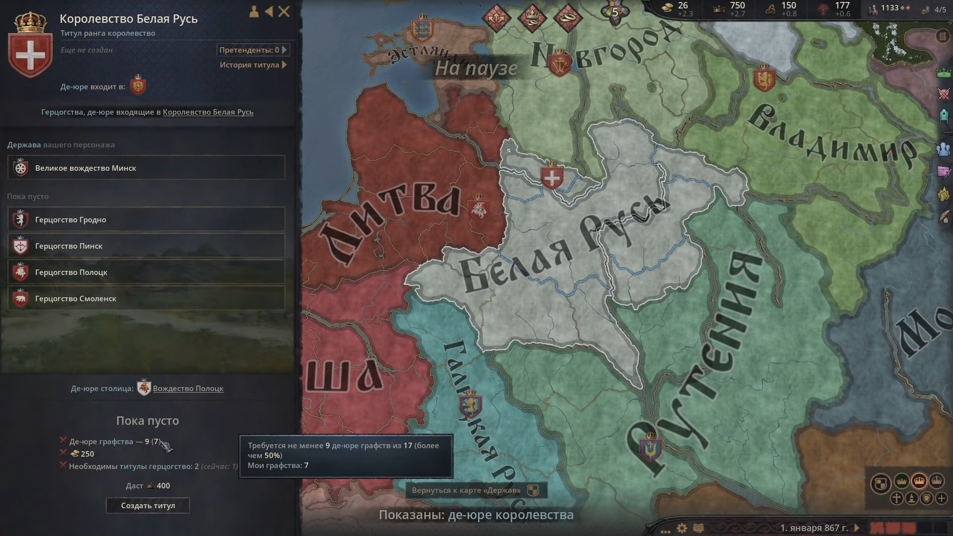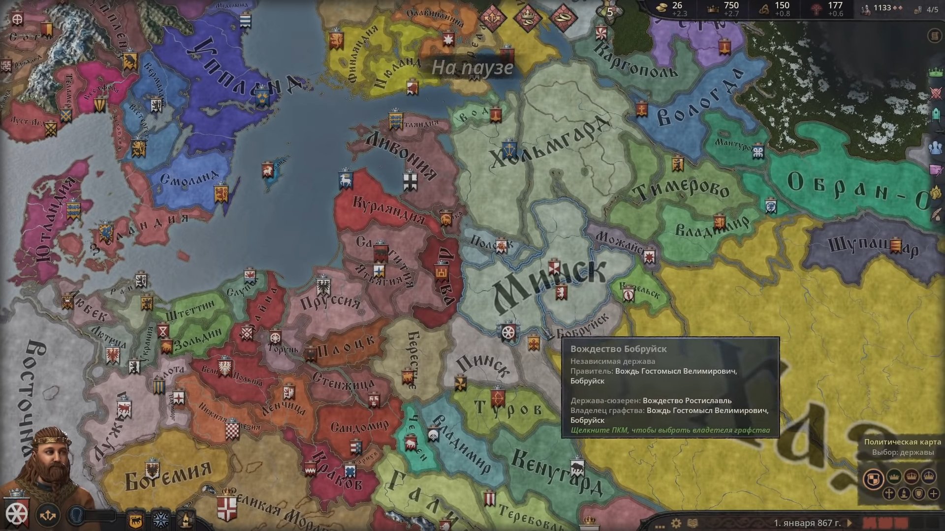 Атмосфера Crusader Kings III строится на контрасте. С одной стороны — короны, войны, союзы, борьба за трон и влияние. С другой — постоянная нестабильность. Правитель может умереть в любой момент, наследник окажется слабым, союзники предадут, а всё, что строилось годами, разрушится из-за одной ошибки или неудачного брака.
