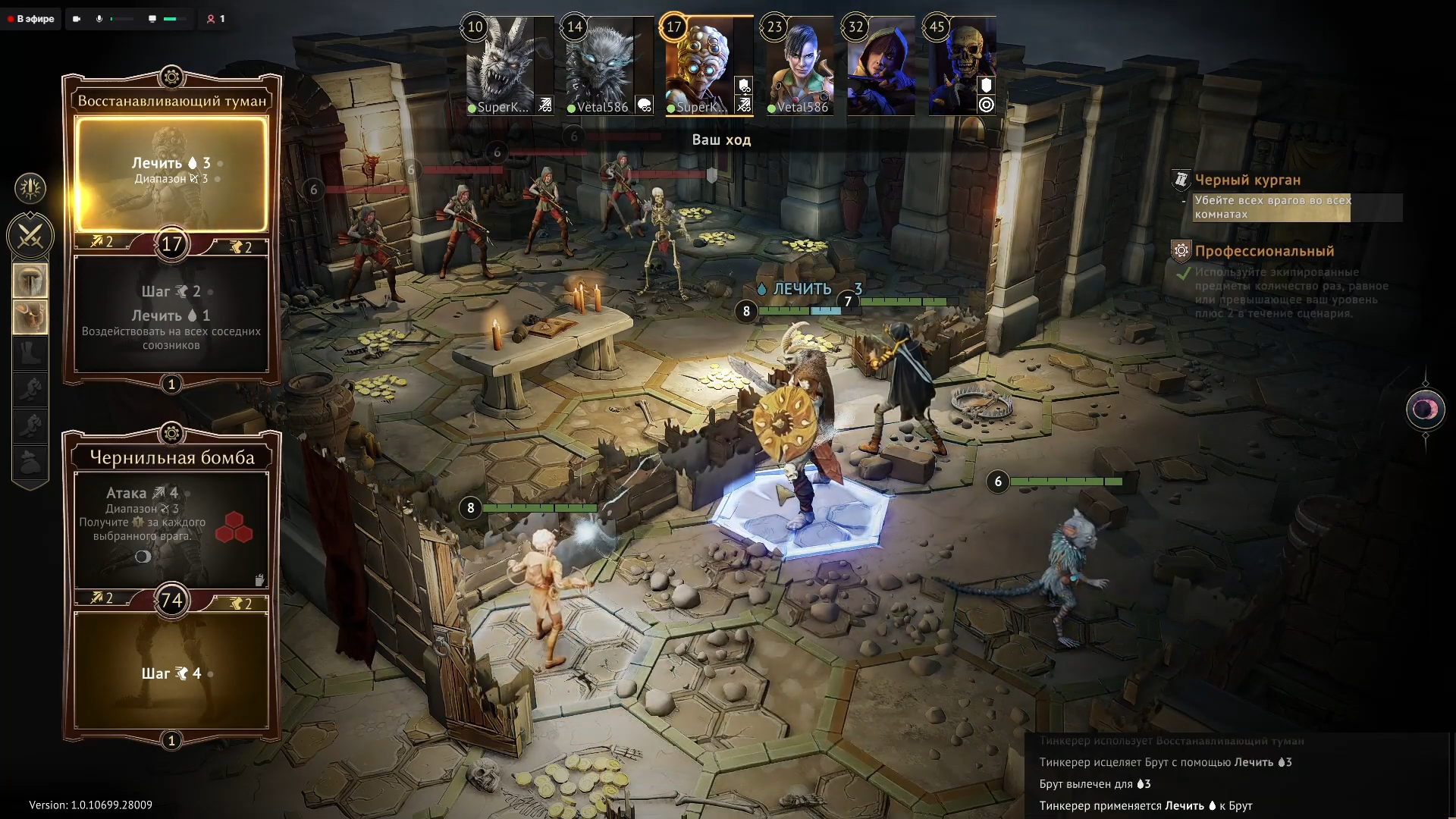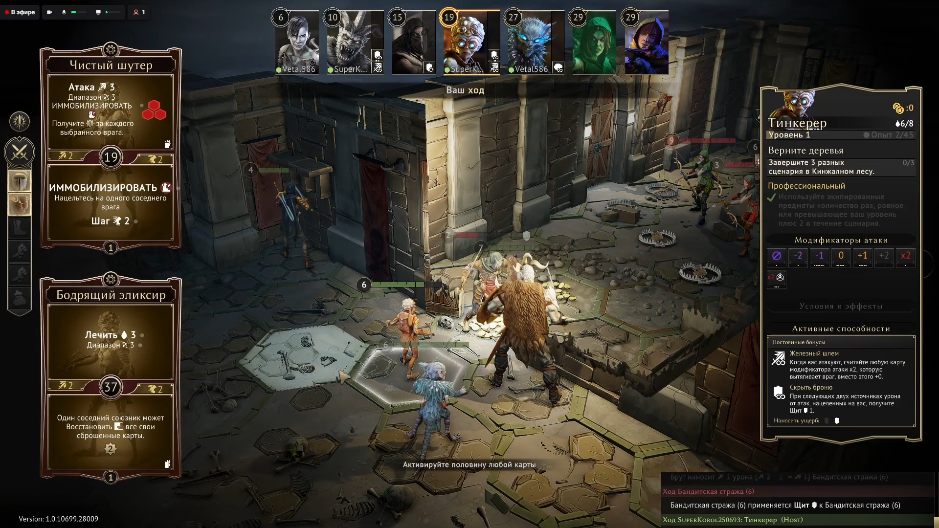 Gloomhaven одинаково хорошо работает и в одиночной игре, и в кооперативе. Совместные вылазки требуют слаженности, но правила не позволяют обсуждать всё в деталях. Приходится считывать намерения напарников по действиям и позиции на поле.