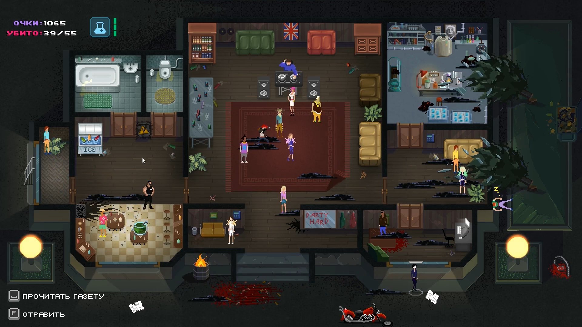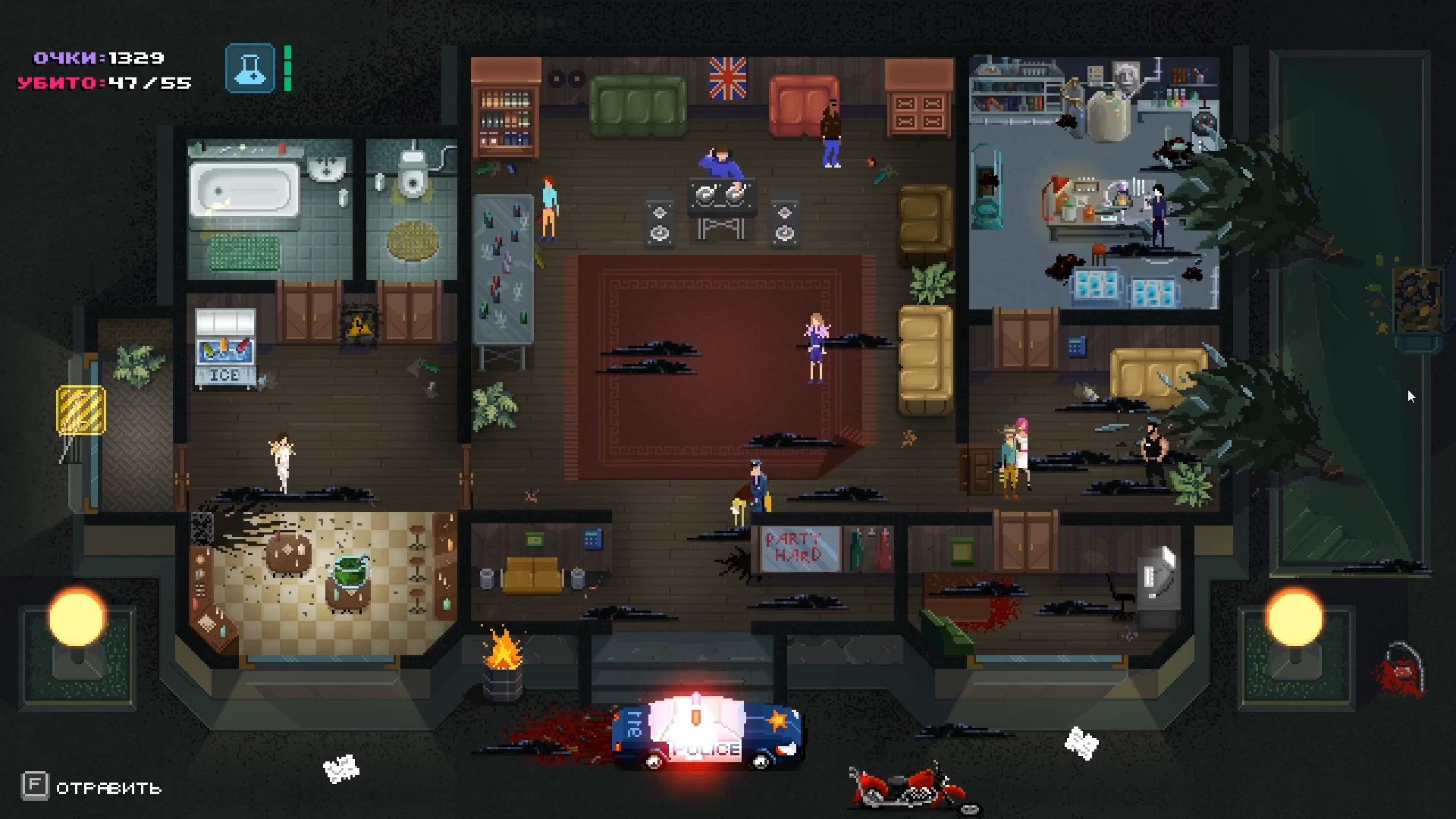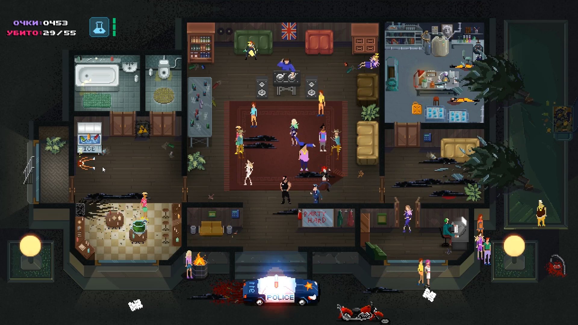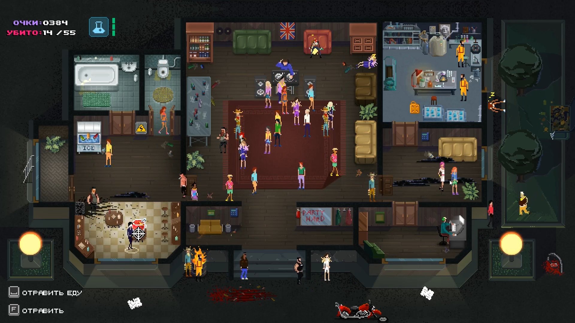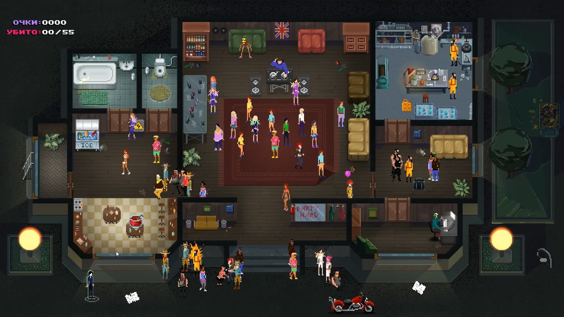 Визуальный стиль добавляет дистанции: будто смотришь на происходящее сверху, как на макет, где каждая фигурка живёт своей вечериночной жизнью. А музыка и общий шум давят фоном и не отпускают. Party Hard не про силу. Она про контроль — и про умение оставаться незаметным в самом заметном месте.