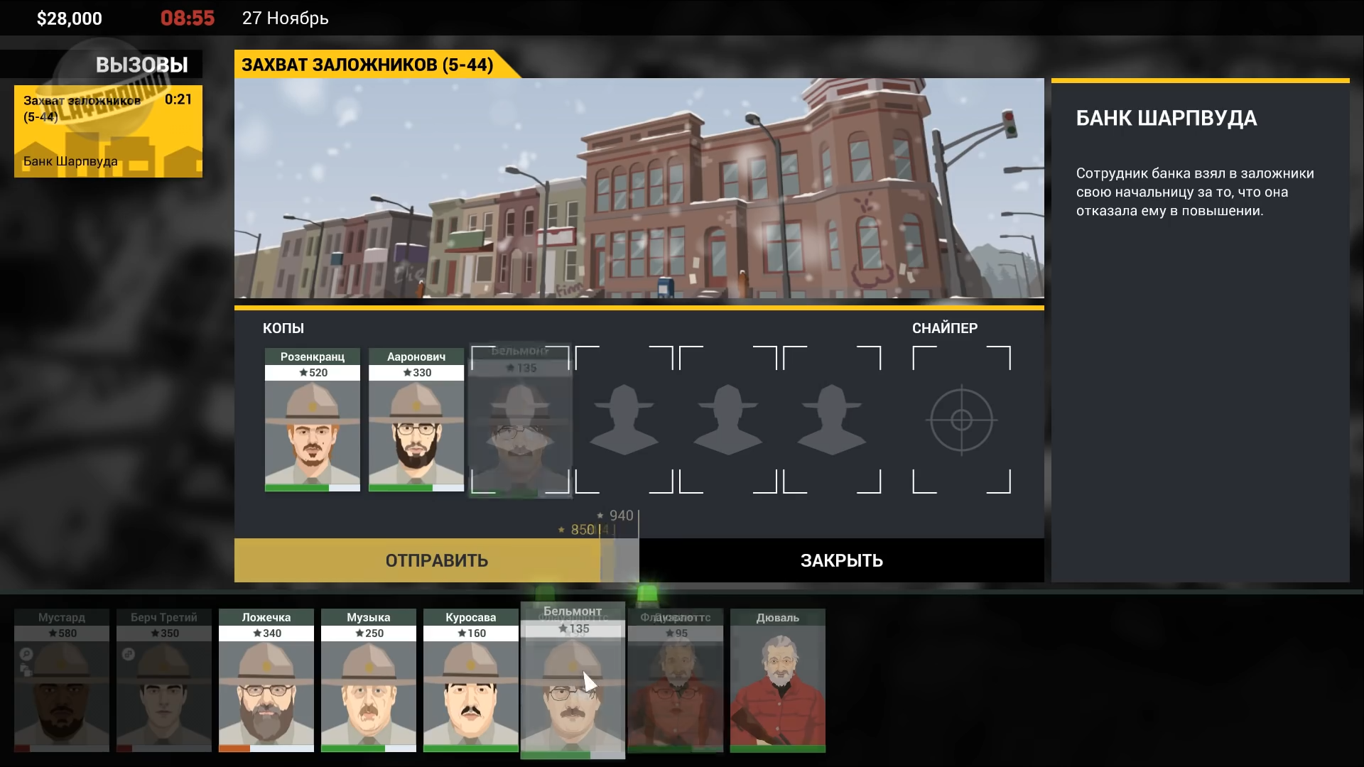 Во время самых опасных миссий игра перейдет в режим пошагового тактического боя. Соберите отряд из своих лучших копов (или пошлите на задание пьяниц и тупых лентяев – ситуации бывают разные!). Внимательно изучите местность, скорректируйте свои планы, незаметно подберитесь к подозреваемым и используйте нелетальное оружие и экипировку – если ситуация позволяет, конечно. Да, порой перестрелок почти невозможно избежать, но будьте осторожны: в This Is the Police 2 ни у кого нет шкалы здоровья. Одна пуля может стоить копу жизни.