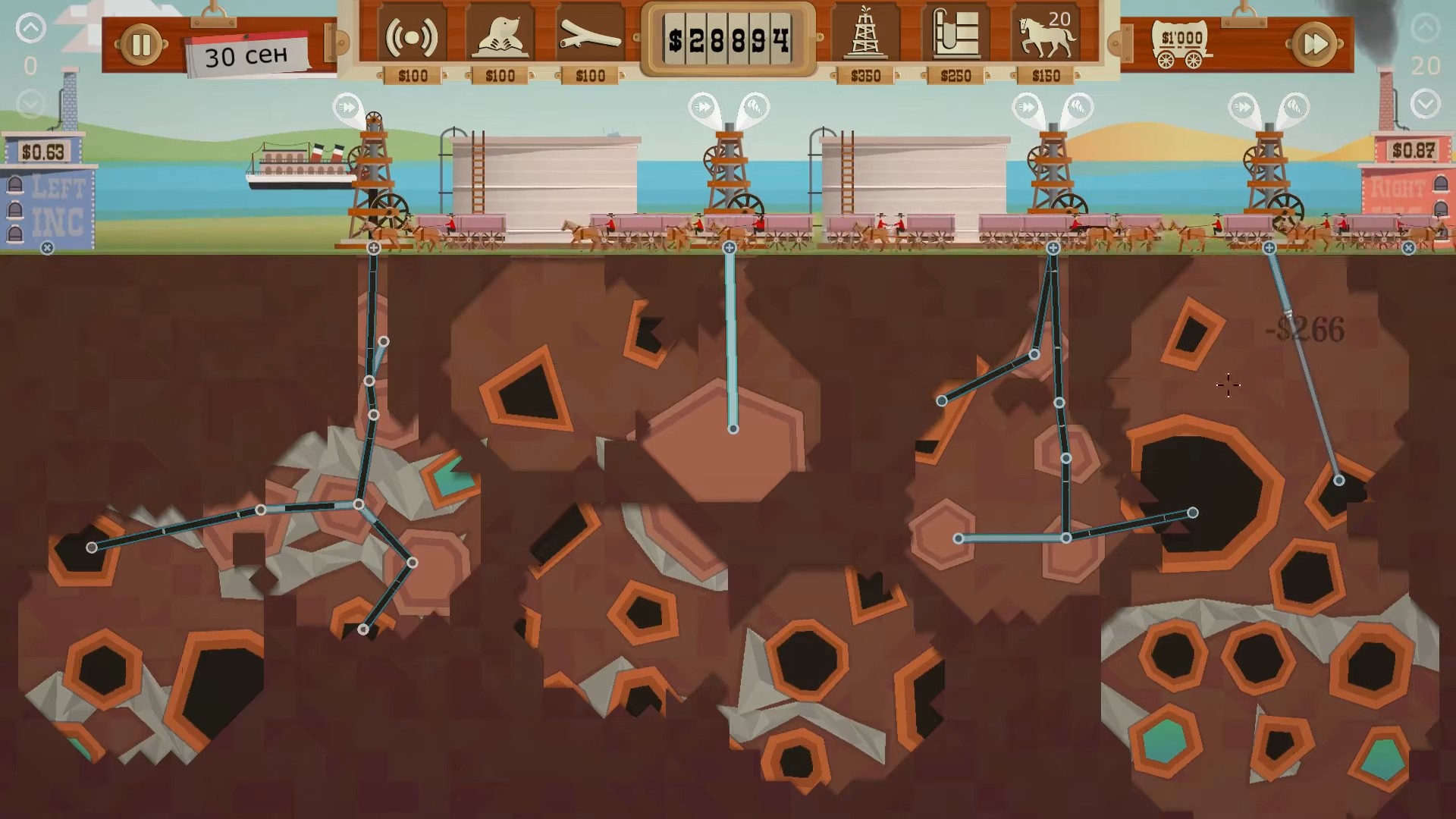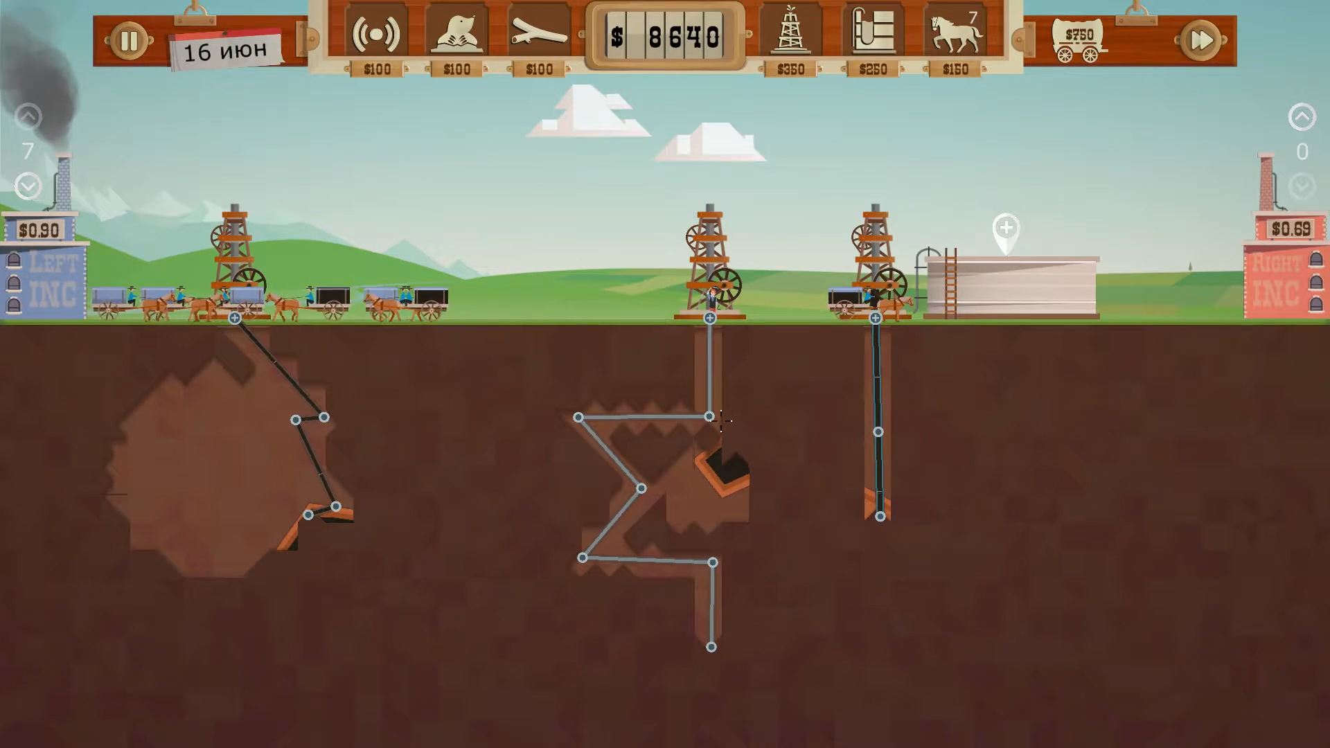 Ощущения строятся на контрасте между спокойной работой на участке и резкими решениями в нужный момент. Вы начинаете с пустой земли и тишины — и буквально «слушаете» недра. Нужно понять, где бурить, как не промахнуться и как не потратить лишнее, пока соперники уже запускают первые скважины. В Turmoil хорошо видно, как мелочи складываются в результат: неудачно поставили вышку — потянете трубы в обход, лишняя развилка съест прибыль, продали слишком рано — и потом будете смотреть, как цена растёт без вас. Напряжение держится без катастроф: хватает времени, рынка и вечного спора между жадностью и осторожностью.